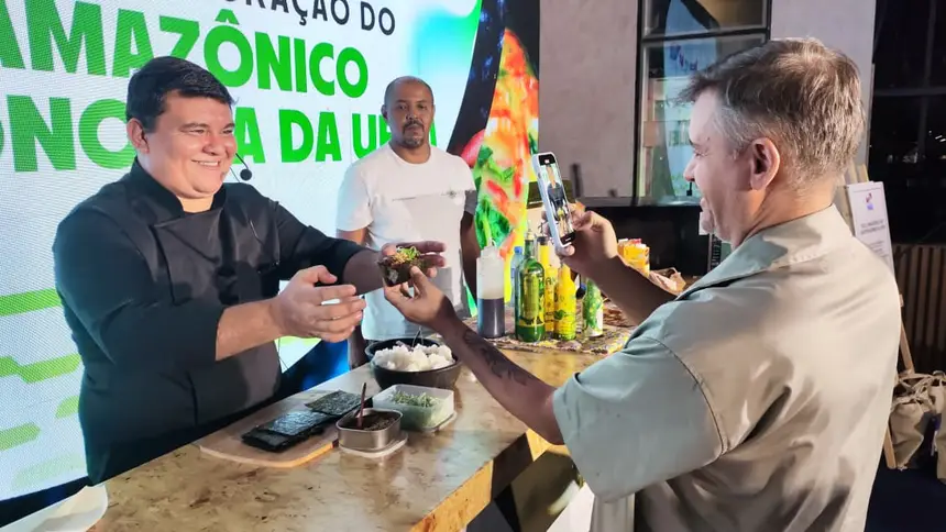 Liberdade para criar sabores – O chef Arturo Baez preparou o prato “Sabor Apoema”, que consiste em uma musse de abóbora com puxuri, e charque salteado com caponata de jambu. Segundo ele, “o prato Sabor Apoema nasce da ideia de olhar a gastronomia amazônica além do óbvio. Apoema significa criação, enxergar além do esperado. Por isso, eu trago ingredientes da nossa região em novas leituras: uma musse de abóbora perfumada com puxuri, uma especiaria amazônica, e charque salteado com caponata de jambu, criando um diálogo entre Amazônia e Mediterrâneo. É a nossa cozinha com identidade, mas também com liberdade criativa”.