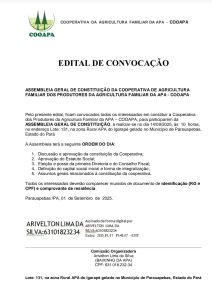 A Cooperativa de Agricultores de Agricultura Familiar dos Produtores Rurais da APA, (COOAPA) , por meio do resposnabel pela comissão de assembleias Arivelton Lima Silva, devidamente representado no uso das atribuições que lhe confere o Estatuto Social, e em cumprimento às disposições legais, convoca através deste edital todos os(as) Associados, para a Assembleia Geral a ser realizada em no dia 14/09/2025, às 10 horas, no endereço Lote: 131, na zona Rural APA do Igarapé gelado no Município de Parauapebas. Segue abaixo o Edital de Convocação:
