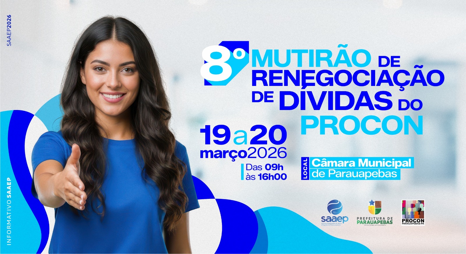O Serviço Autônomo de Água e Esgoto de Parauapebas (Saaep) confirmou sua participação na oitava edição do Mutirão de Negociação de Dívidas, realizado pelo Procon Municipal. A ação acontece entre os dias 19 e 20 de março, na Câmara Municipal, com atendimento ao público das 9h às 16h.