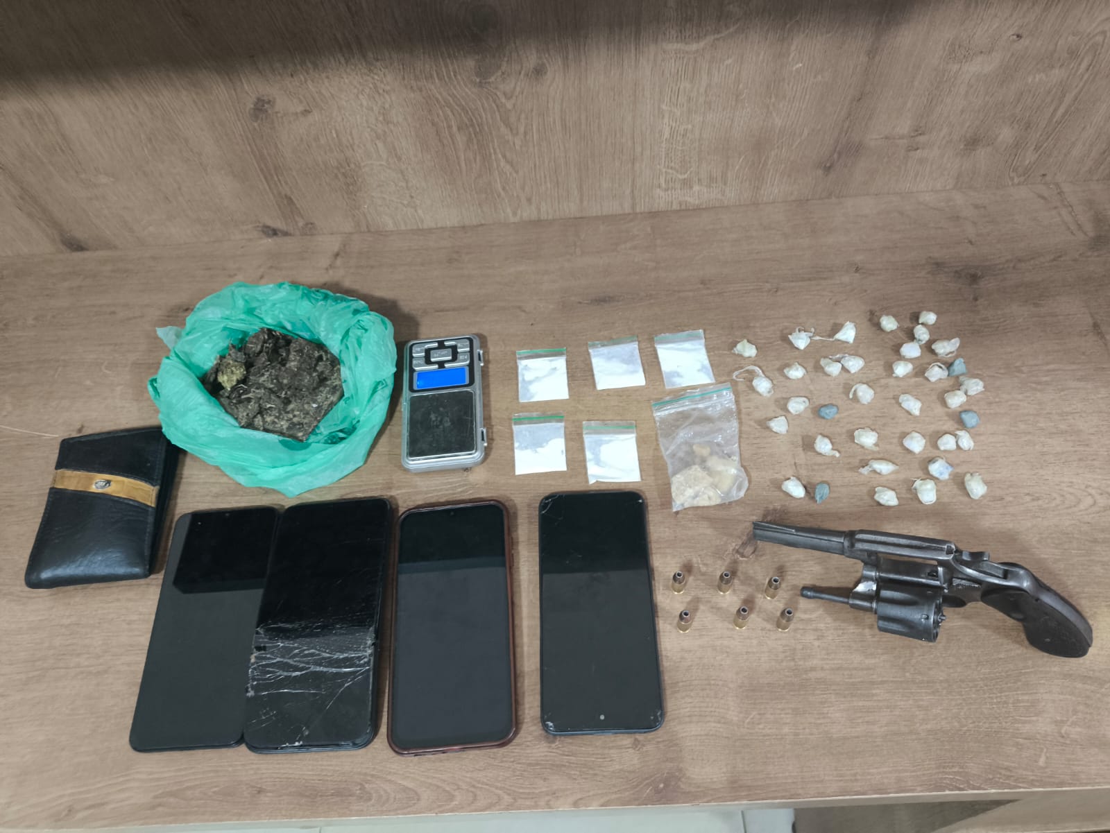 Durante o cerco policial, um dos suspeitos tentou fugir pelos fundos do imóvel e chegou a arremessar uma sacola contendo entorpecentes. No interior da casa, os policiais localizaram outros três homens. No local também foram apreendidos um revólver com numeração suprimida e munições, além de crack, cocaína e maconha.